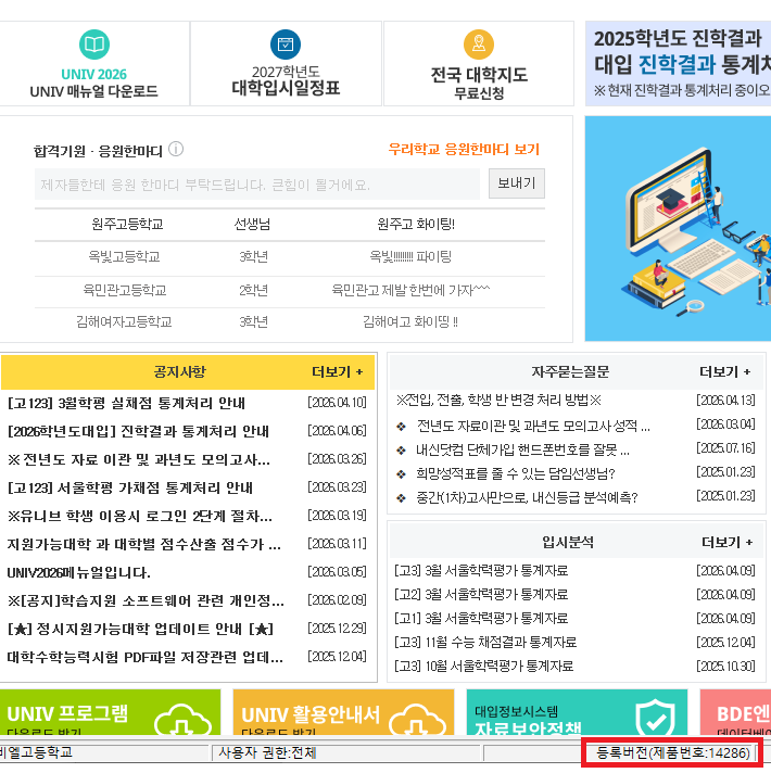 [기초작업] → [학교기본정보]/[학과기본정보]/[학생기본정보] ← 3가지 기초작업을 완료하면 자동으로 랜덤번호가 생성됩니다. [기초작업] → [사용자등록/암호변경]/[프로그램 등록하기] 프로그램 재 실행 ← 재 실행 시점부터 아래 이미지처럼 정상적으로 등록버전으로 사용됩니다.