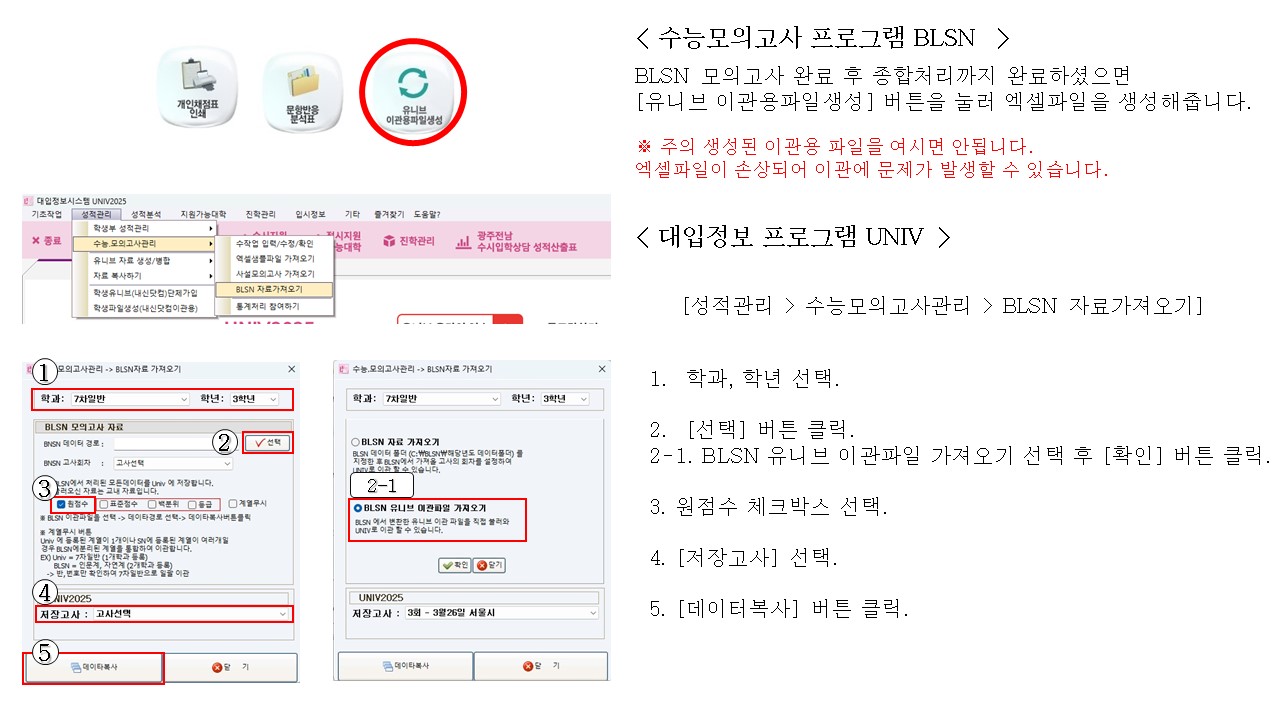 BLSN 모의고사 완료 후 종합처리까지 완료하셨다면 [유니브 이관용파일생성] 버튼을 눌러 엑셀파일을 생성해줍니다.